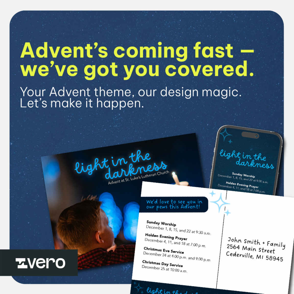 This advent season, Vero Communications is here to help elevate your advent invitations - you share a few pieces of information and they'll develop the creative materials! They'll take your already-developed Advent theme and build-out marketing materials that elevate your message.