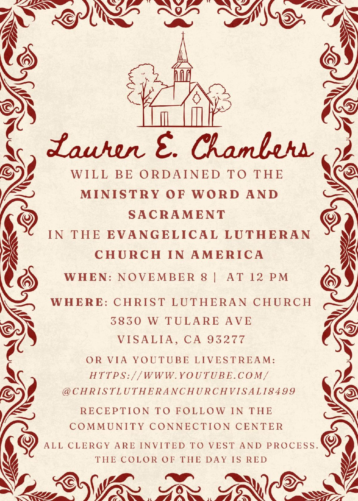 Join us in celebrating the Ordination of Lauren E. Chambers into the Ministry of Word and Sacrament. Lauren has been called to serve as Pastor at Hope Lutheran San Mateo. The service will take place on Saturday, November 8 at 12:00 PM at Christ Lutheran Church in Visalia, with a reception to follow.
