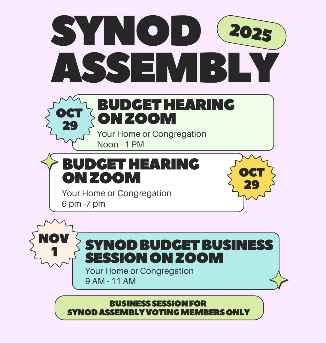 On Saturday, November 1 from 9 AM - 11 AM, Synod Assembly voting members will gather for the business session on Zoom and vote on the proposed budget. The link was sent to voting members on October 22.