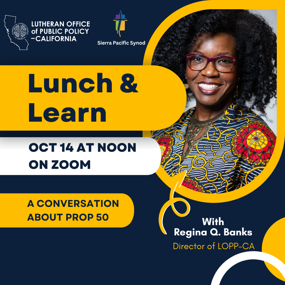 To learn more, you’re invited to a Lunch & Learn with Regina Q. Banks, Director of the Lutheran Office of Public Policy–California, on Tuesday, October 14 at noon via Zoom. Regina will share more about LOPP-CA’s discernment on Proposition 50 and answer questions.