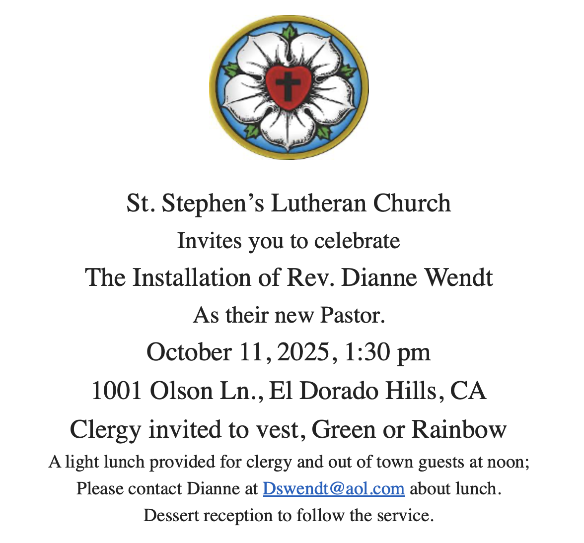 St. Stephen's Lutheran Church invites you to celebrate the Installation of Rev. Dianne Wendt as their new Pastor.