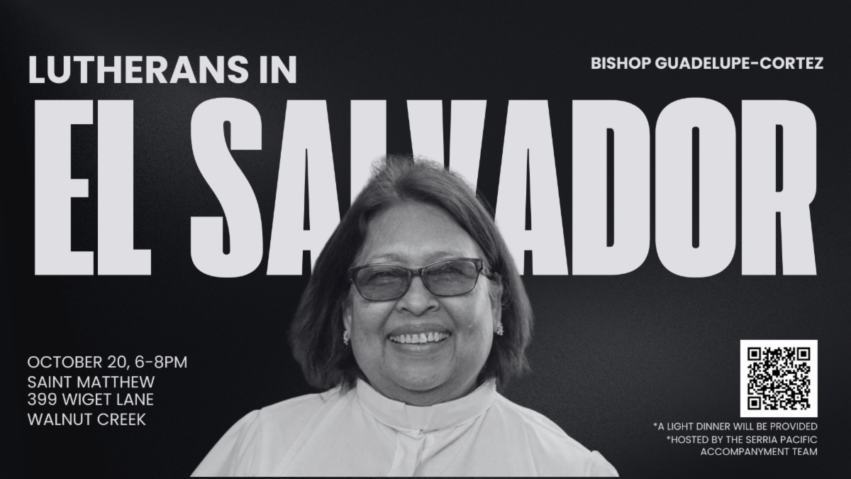| Lutherans in El Salvador - October 20 | Learn what it means to be Lutheran in El Salvador! Join Bishop Guadalupe Cortez as we hear about the ministry of our companion synod, the El Salvador Lutheran Synod. The event will take place at St. Matthew’s, Walnut Creek, on Monday, October 20, from 6–8 PM, with a light meal provided. Register HERE! | |