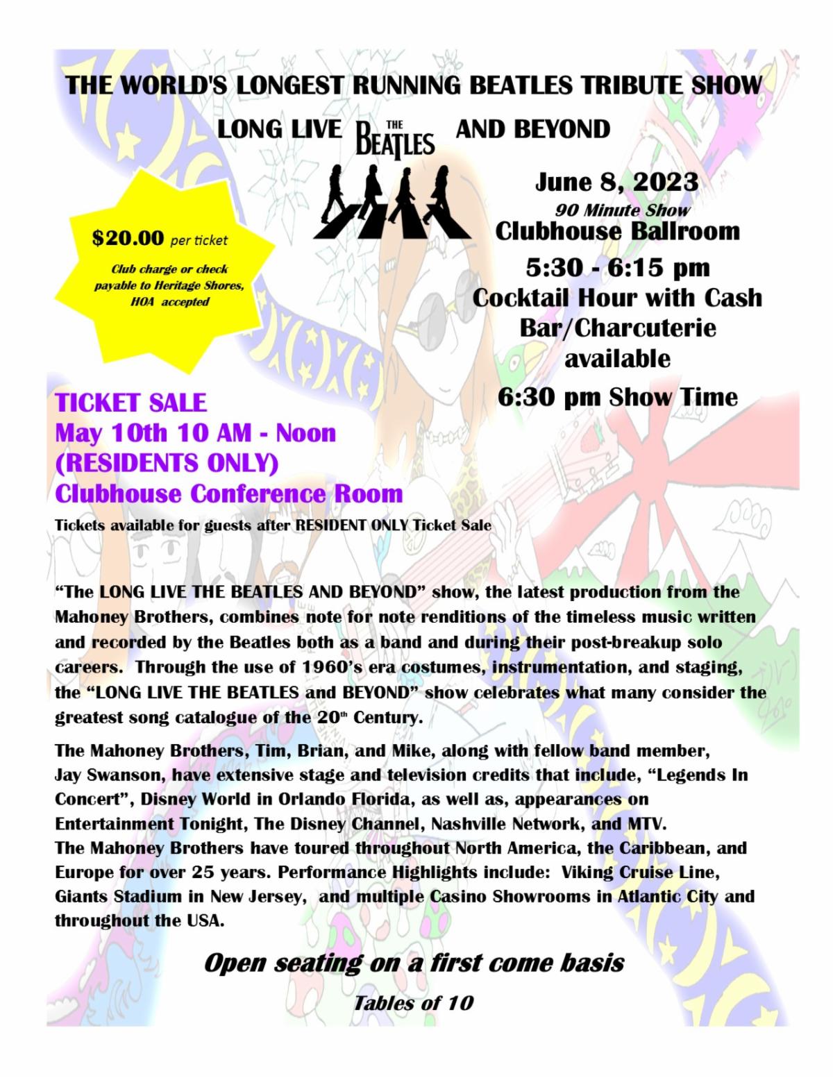 A friendly reminder that ticket sales go live tomorrow May 10th for the Beatles Tribute show “Long Live the Beatles”. The tickets will be available for purchase in the conference room located at the clubhouse from 10 AM to Noon. The Beatles event is an Open Seating event. Tickets will be provided to residents as they arrive for line placement. In addition to the Beatles Tribute ticket sale, the Travel Club will be selling tickets to the NJ Food Tour Bus Trip.