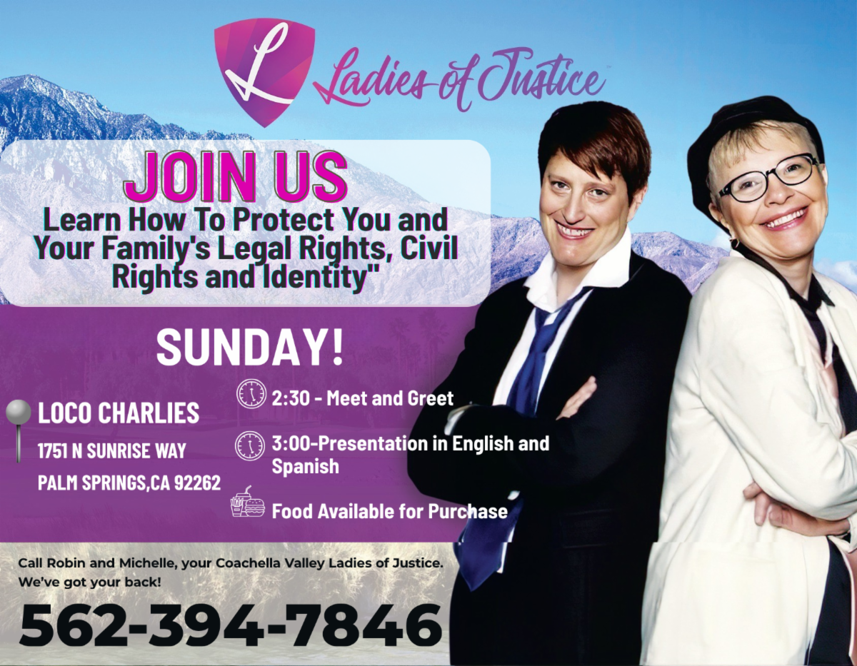 1st and 3rd Fridays are Wine Down Friday’s with the Coachella Valley Ladies of Justice and a Guest Speaker at theV-Lounge 5PM-6:30P. 600 E Tahquitz Canyon Way, Palm Springs.