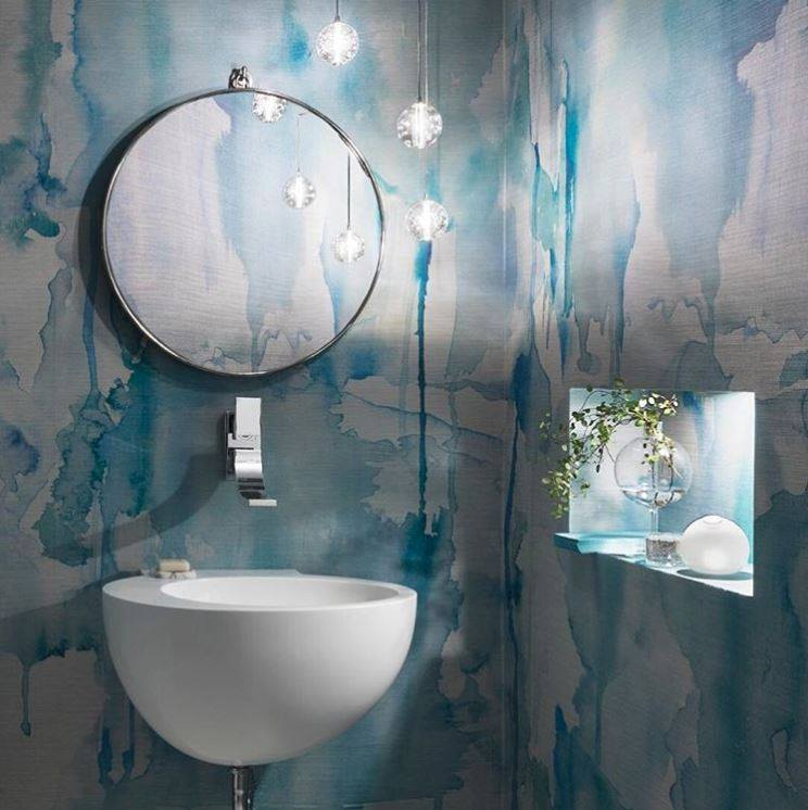 Shown above: Newterra console & concrete sink, Eleganza faucet, Linea mirror and towel stand, Flou tub filler, Giulia tub and toilet, Waterblade shelves