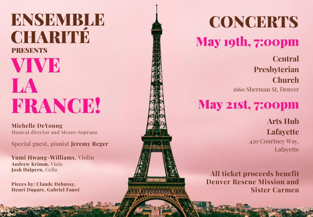 In the upcoming May 21, 2026, concert scheduled for 7pm at The Arts Hub, Ensemble Charité will be performing Vive La France, featuring French composers Debussy, Duparc and Fauré.