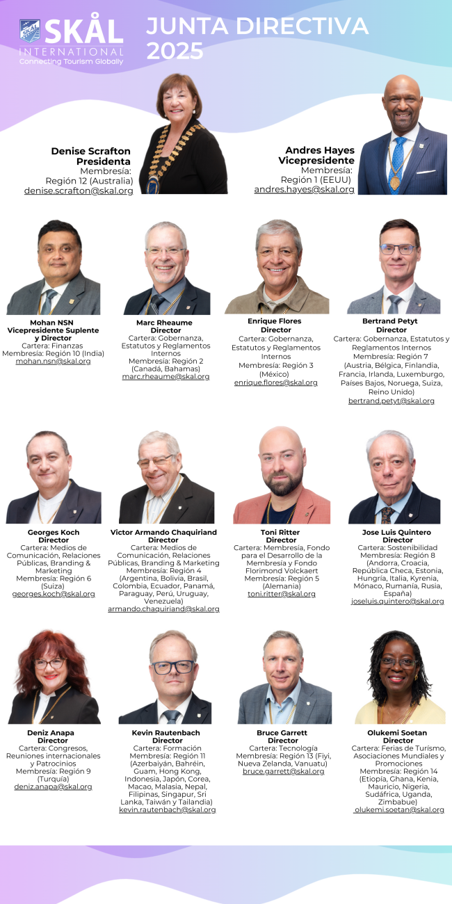 - La selección será realizada por los Directores basándose en las cualificaciones, asegurando el éxito de nuestro tema para el año, manteniendo al mismo tiempo una amplia representación en todas las regiones de Skål International.