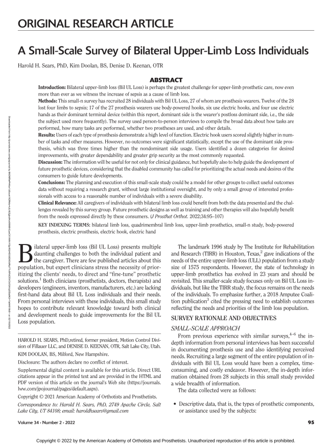 Bilateral Upper Limb Loss Publication in the Journal of Prosthetics and Orthotics