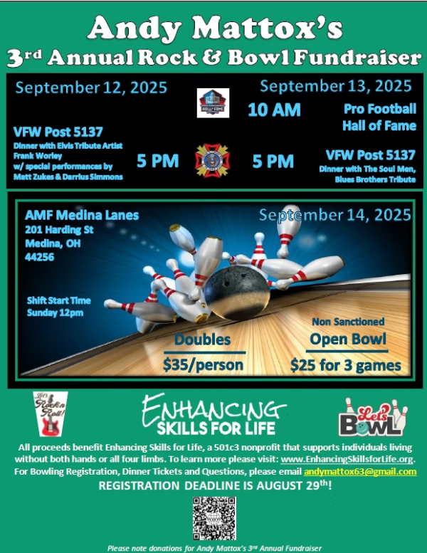 We’re gearing up for Andy’s Third Annual Rock & Bowl Fundraiser happening September 12–14 in Medina, OH, and you won’t want to miss this incredible weekend of fun, community, and support for those living without both hands, arms, or more limbs. BONUS- Join Andy & Sam on Zoom this Sunday at 6:00 to hear Andy talk about what you can expect.