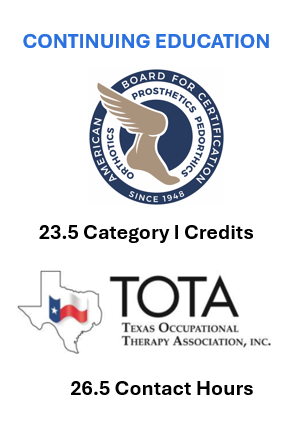 Continuing education credits will be offered for therapists and prosthetists. The SFL 7 Workshop has been approved by ABC for 23.5 Category I credits and by Texas OT Association for 26.5 contact hours. Prosthetists will also receive Category II credits for the Exhibit Hall. PT/OTs, you can submit the SFL certificate to your state licensing board for approval, which can then transfer those hours.