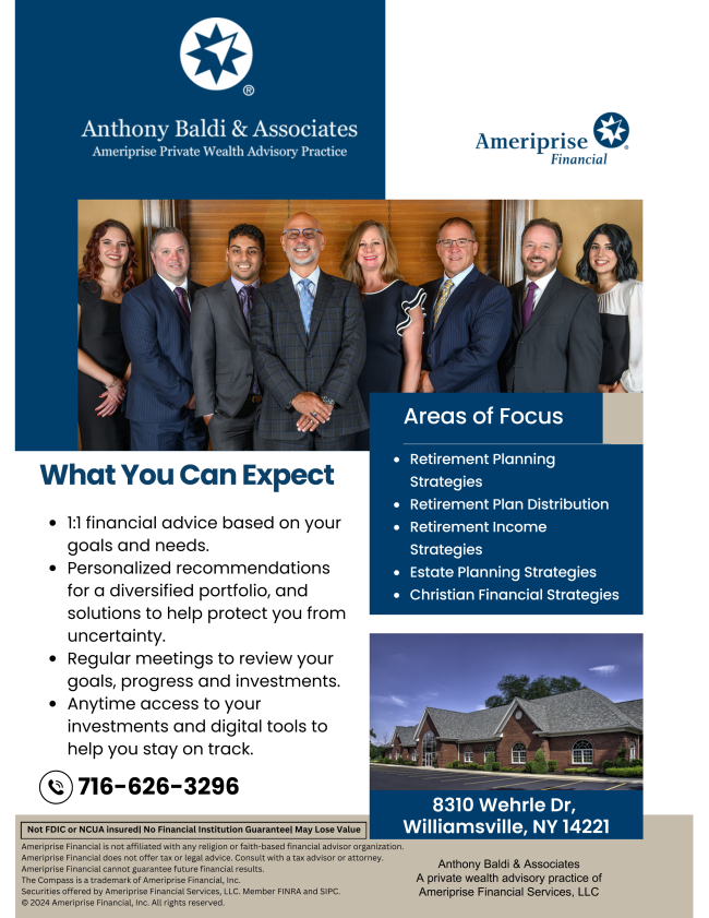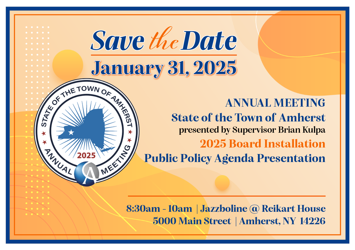 It's hard to believe the Chamber's Annual Meeting is right around the corner, on Friday, January 31st, at Jazzboline at Reikart House. We will once again unveil our Public Policy Agenda, install our 2025 Board of Directors, and hear from Amherst Town Supervisor Brian Kulpa about the State of the Town of Amherst. We have had a standing-room-only crowd for the past two years, and I anticipate we will once again have that. If you have a concern about a regulatory or tax issue at any level of government, please email us at info@amherst.org so our Economic Development/Public Policy Council can review the issue further.