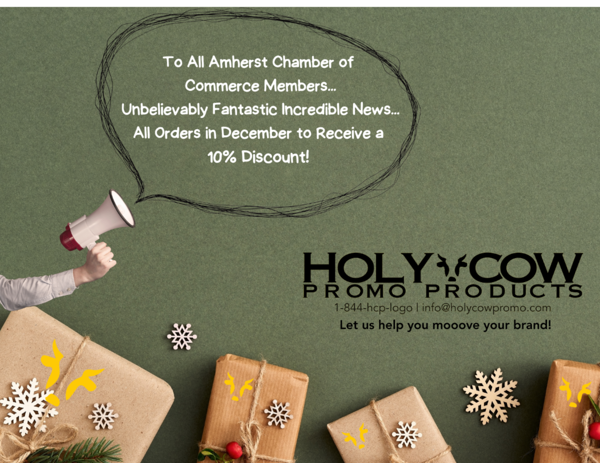 I trust that everyone had a very Happy Thanksgiving and is now busying themselves with the end-of-the-year rush on shopping for loved ones, meeting old friends, and planning for the holiday celebrations, all while trying to ensure you finish the year strong from a business and goal standard. The Chamber team is working tirelessly to ensure we serve as an extension of your brand, especially during these crucial weeks for our retail and hospitality businesses. We understand that these next few weeks can turn a mediocre year into a great year, and we're here to support you. This newsletter includes various promotions our members are running through the holiday season. If there is something you would like our members to be aware of, please update your chamber webpage or send any promotional graphics to marketing@amherst.org.