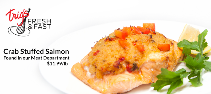 Trig's Fresh & Fast products - the Crab Stuffed Salmon. It is chef-inspired & ready-to-cook! Check out the meat department for this meal for the busy and on-the-go family! (It's heart healthy Salmon too!) More info below.