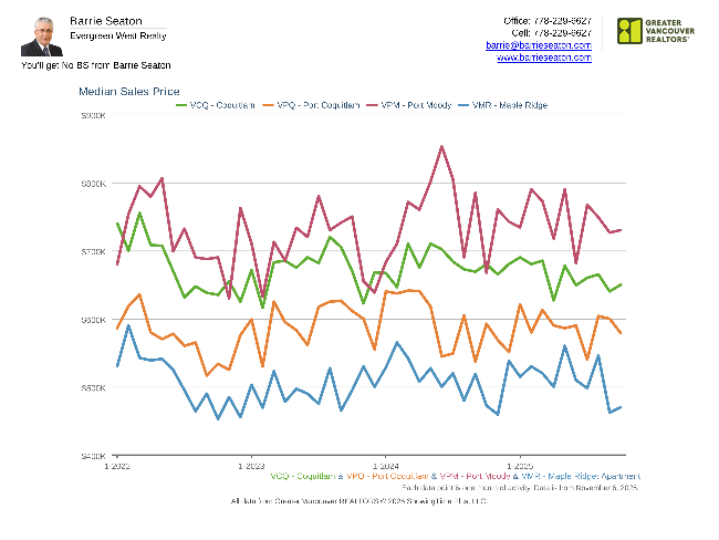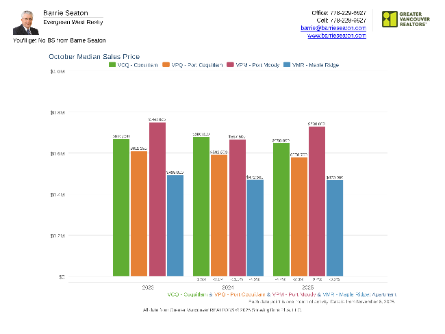 Bar graph showing median sale prices for APARTMENTS in Coquitlam, Port Coquitlam, Port Moody and Maple Ridge since October of 2023.
