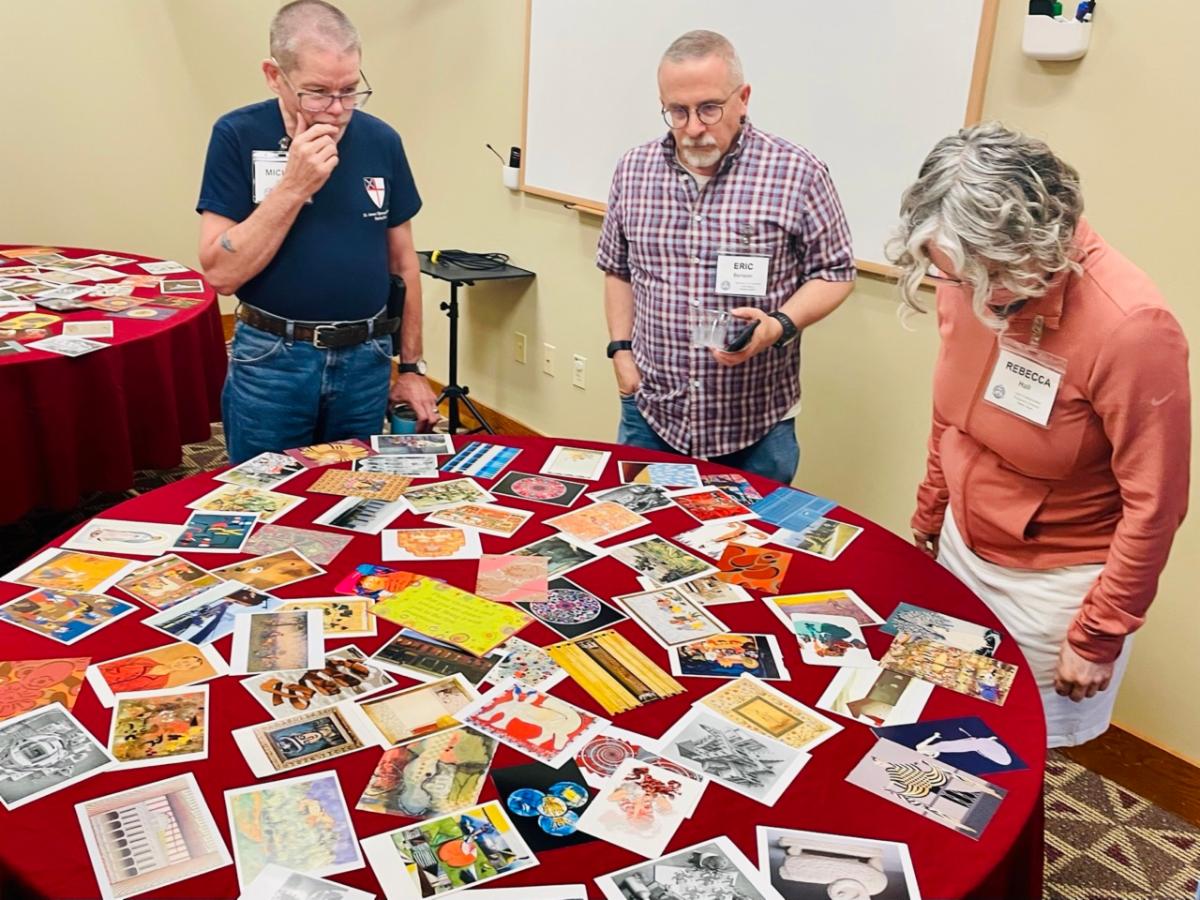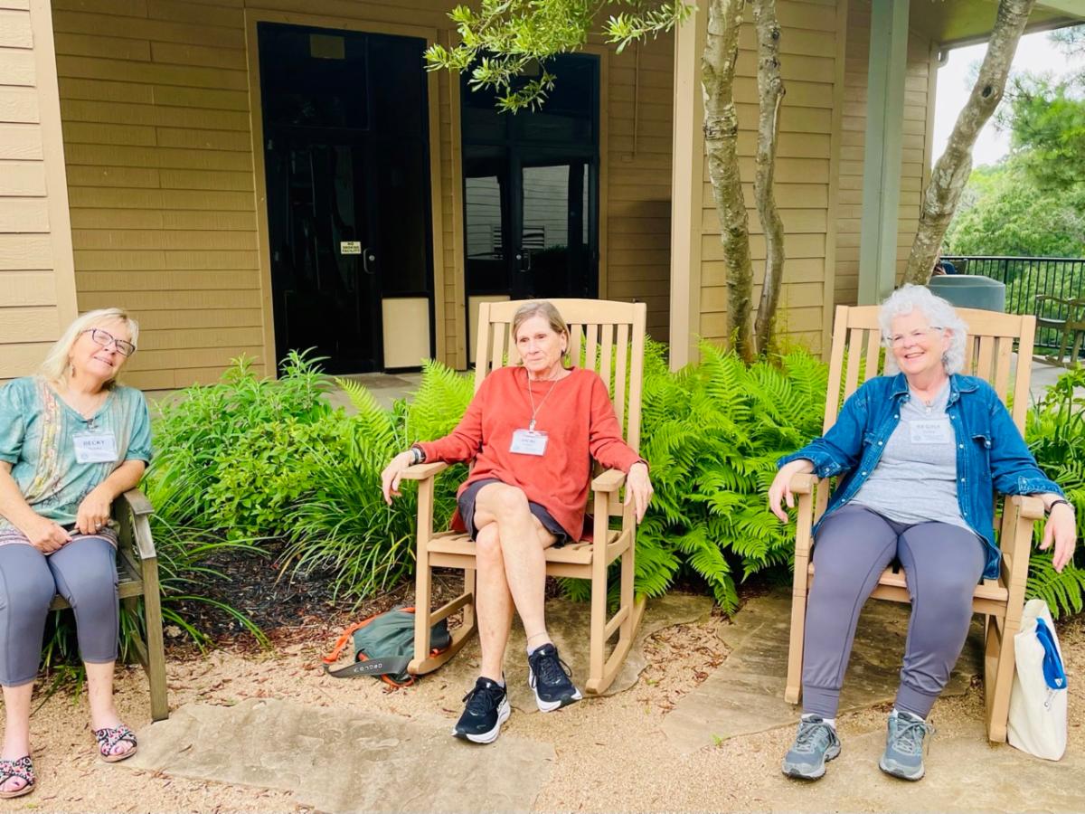 | | Members of the Spiritual Renewal retreat track select images for reflection and sharing. | | Annual Retreat participants Becky Sparks, Vicki Knipp, and Regina Hurley relax between sessions. | | Biblical Interpretation retreat track leaders, John Lewis and Jane Patterson, and track participants. | | |