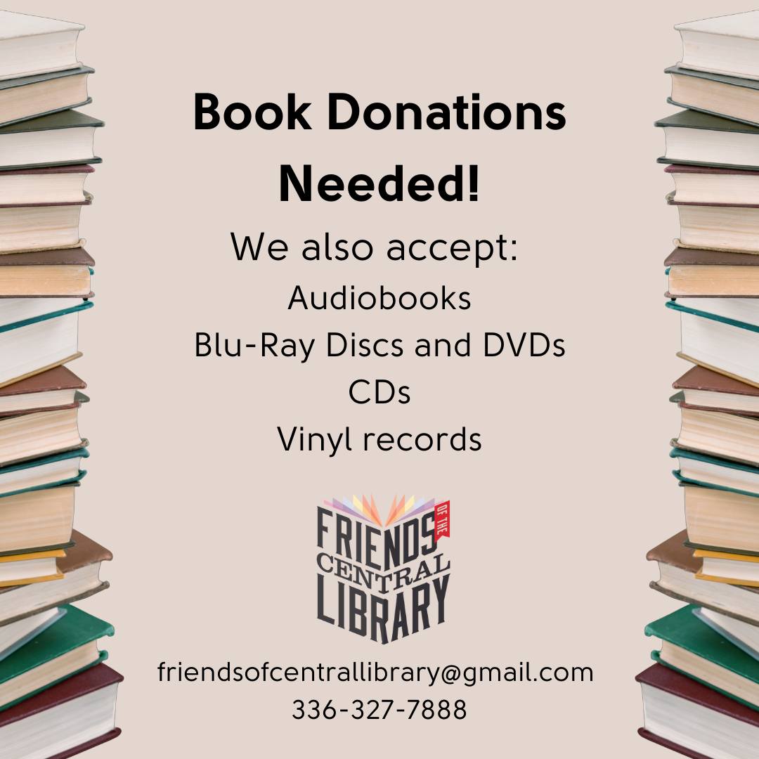 Proceeds from sales are used to improve and support our collection and programs, purchase Summer Reading Program prizes, fund author visits, and much more. For further information, email friendsofcentrallibrary@gmail.com or call 336.327.7888.