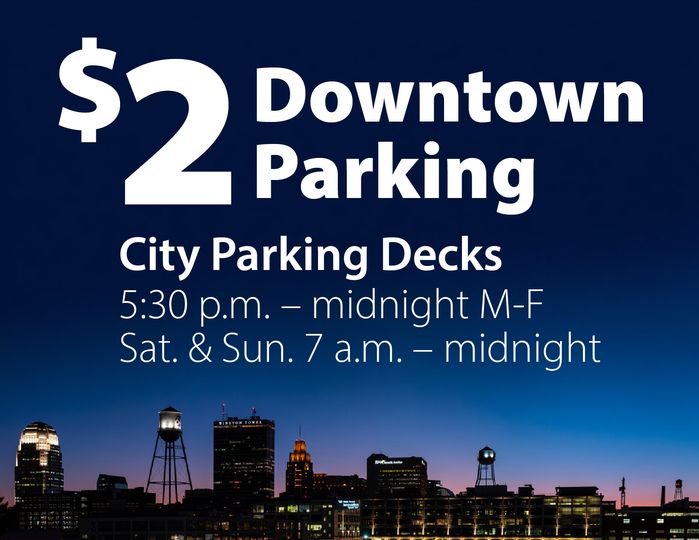 Don’t let high parking fees keep you from coming downtown! The city charges a flat $2 fee at the Convention Center and Cherry-Marshall parking decks, week nights 5:30 p.m. to midnight and all day Saturdays and Sundays.