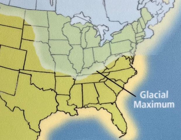 Glaciation terminated north of North Carolina near the southern borders of Kentucky and West Virginia. | |