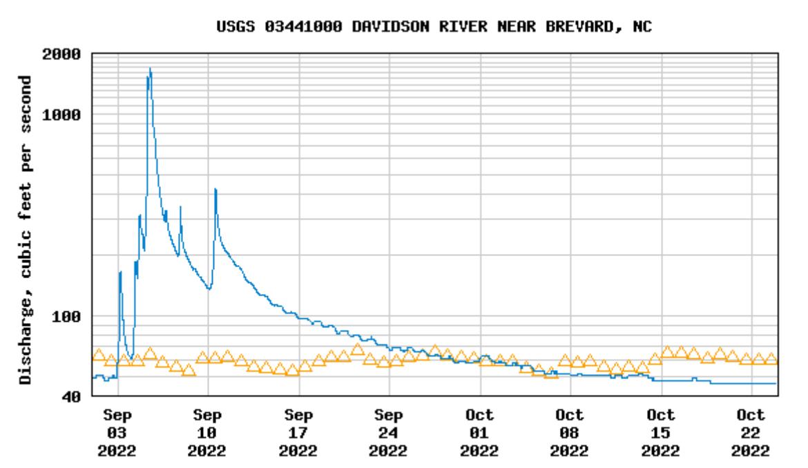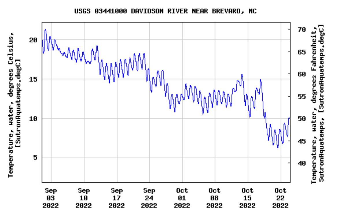 From your phone or computer, you can see what the water flow, levels, and temperatures are on many rivers in North Carolina. The United States Geological Service (USGS) has gages on the Davidson River (located near Hwy 64 behind Hog Wild BBQ) and Mills River (located east of Hwy 280).