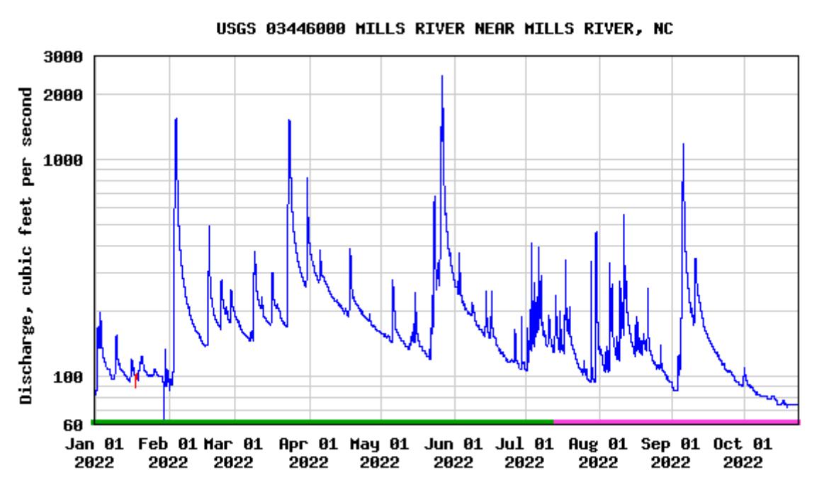 Mills River flows spiked following storm events from January through October. This fall, low rainfall resulted in October flow to be 49% lower than its historic average. | |