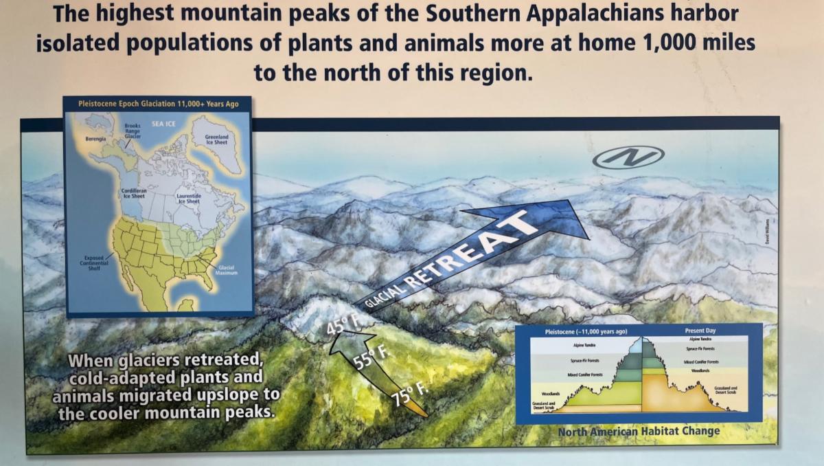 The Blue Ridge Parkway Visitor Center at Craggy Gardens has an excellent display about Sky Islands; why they support species that originated from northern (boreal) regions of the North American continent, and why these habitats are threatened by climate change.