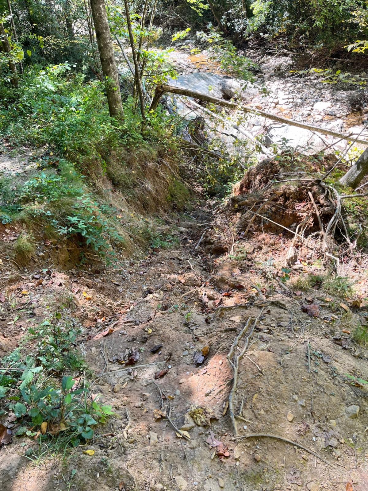 Severe erosion at the landslide site along the Daniel Ridge Loop Trail (105). The slope is very steep in this section and drops into the upper Davidson River. | |
