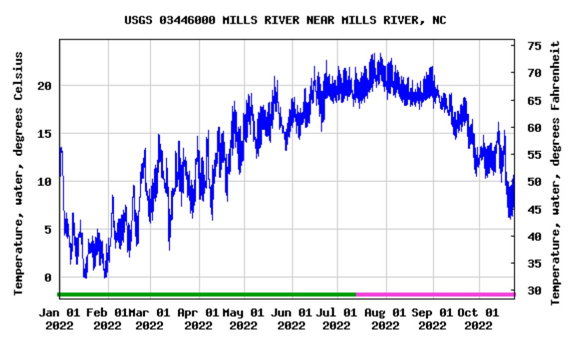 The Mills River gage is downstream of where most trout fishing occurs, and undoubtedly reflects increased temperature from upstream (South and North Mills). | |