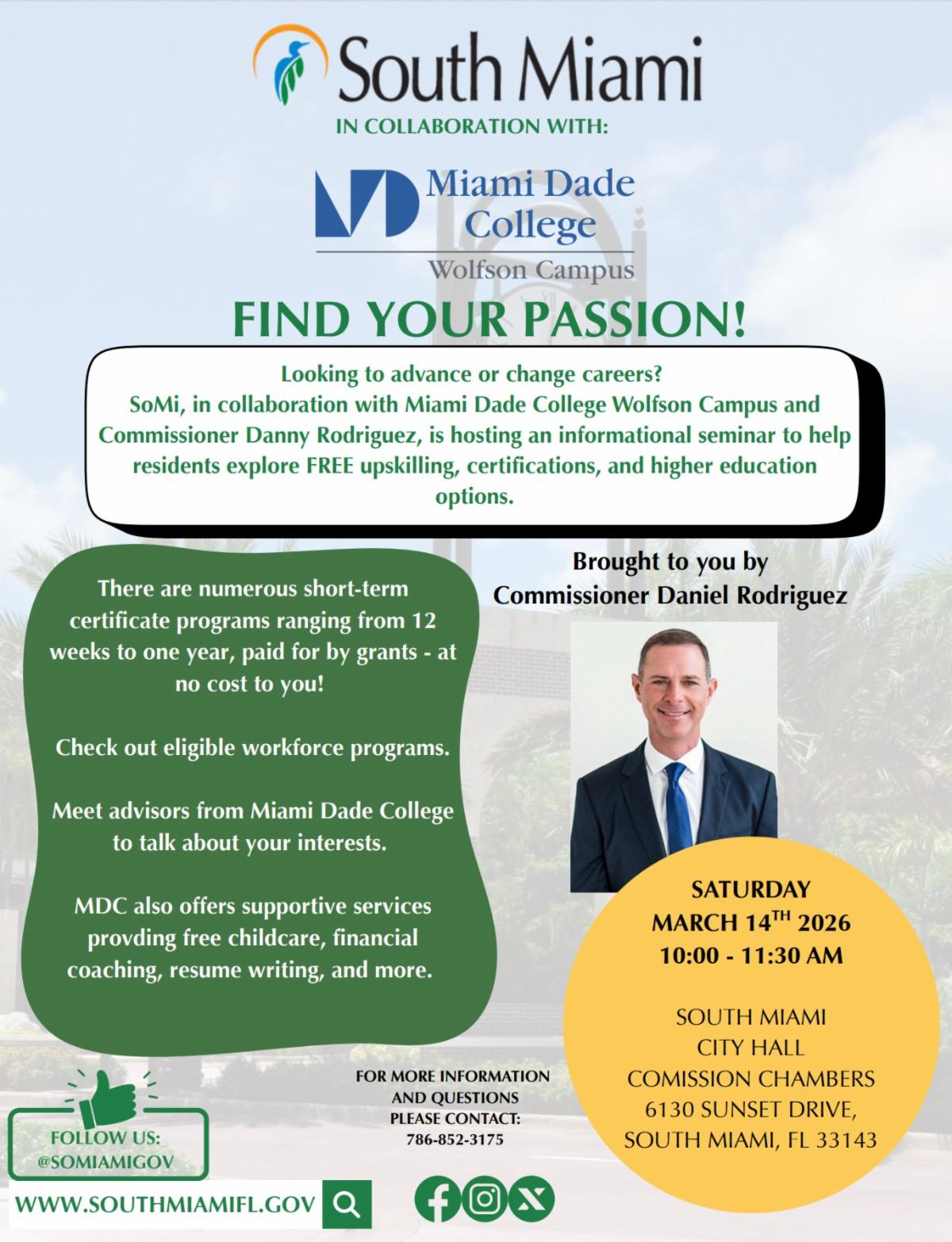 Looking to advance your career or learn new skills? Join the City of South Miami, in collaboration with Miami Dade College Wolfson Campus and Commissioner Danny Rodriguez, for a FREE informational seminar on workforce training, certifications, and higher education opportunities.