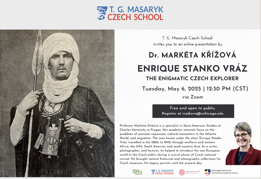 This time, we are bringing back Prof. Křížová and her lecture on the enigmatic Czech traveler with ties to Chicago, Enrique Stanko Vráz. If you missed her in-person talk at our school and at the University of Chicago in February, this is your chance.