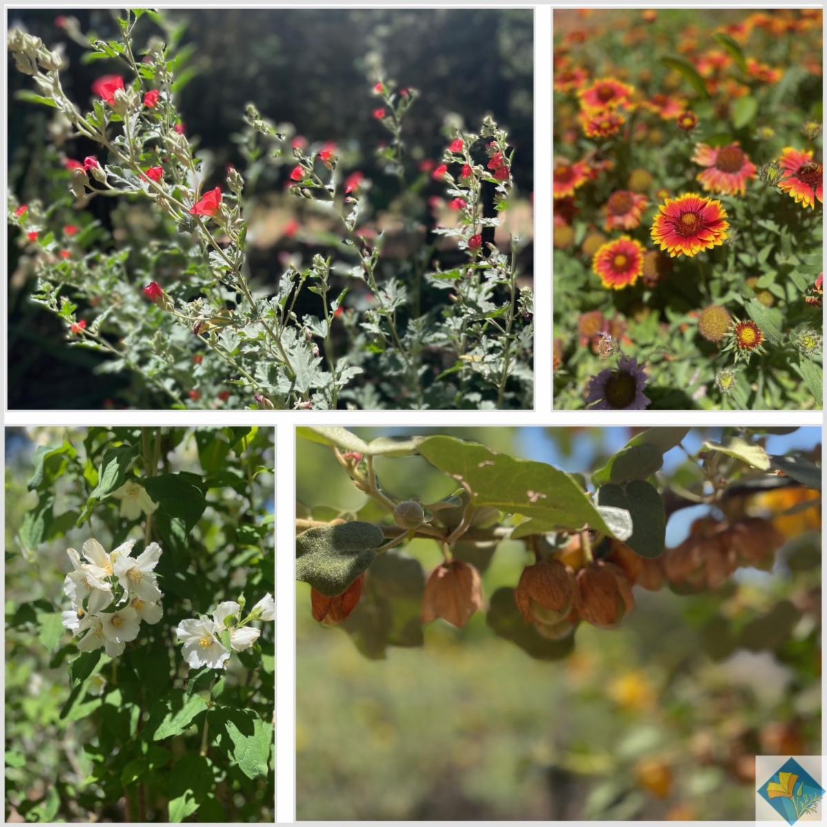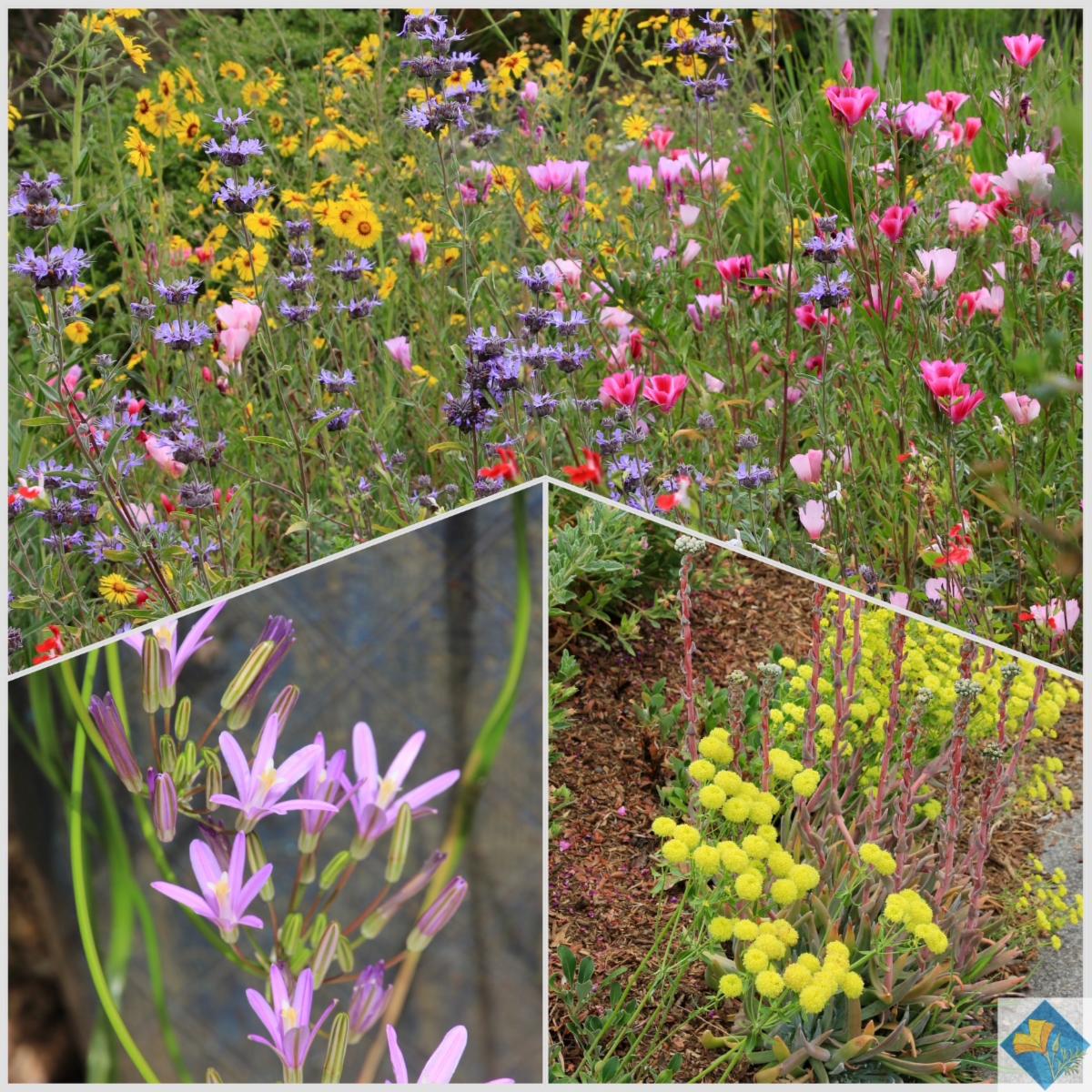 Eriogonum nudum 'Ella Nelson's yellow', Clarkia amoena (farewell to spring), Diplacus aurantiacus 'Creamsicle'(sticky monkey flower)