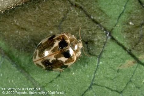 Speaking of powdery mildew, did you know that there is a tiny lady beetle that eats the powdery mildew fungus? It’s biological control in action! This Psyllobora beetle is related to the familiar lady beetle (a.k.a. ladybug) but it is smaller in size and cream-colored with brown spots. You can look for it where you find powdery mildew, and learn more about this fascinating beetle here: click here