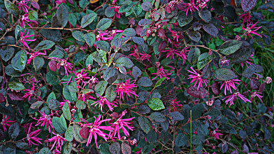 Chinese fringe flower (Loropetalum chinense) is a large evergreen bush with graceful, arching branches. There are many kinds available, but the purple-leafed pink-flowering varieties are especially beautiful. It typically grows six to eight feet tall but can reach 20 feet or more.