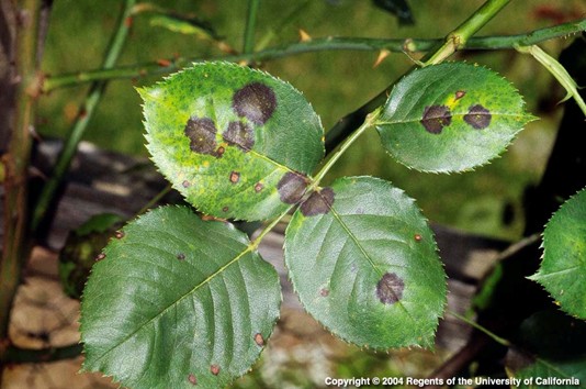 Do you see black spots on the leaves? This disease is easy to remember because it is called black spot. It is caused by a fungus that grows on the upper surface of the leaves when they remain wet for more than seven hours. To lower the chance of infection and help control the disease once you see symptoms, avoid overhead watering. If you need to wash the leaves, be sure to do it early in the day so leaves have a chance to dry before evening. To find additional strategies for black spot identification and management here: click here
