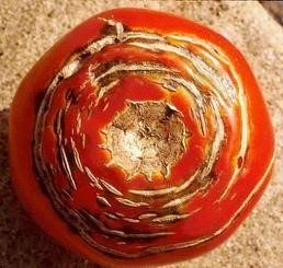 | | Sunscald is another common tomato problem. When tomatoes are exposed to the hot sun, they may develop a white leathery patch on the surface facing the sun. The exposed areas often become sunken and wrinkled. When the fruit turns red, the leathery area remains white and sometimes becomes covered by black, secondary mold. Affected tomatoes are edible unless mold has developed on them. Tomatoes are most susceptible to sunscald when they are a mature green and just starting to turn color, especially if there is insufficient foliage on the plant. Make sure not to prune leaves and branches that are protecting developing fruit. If necessary, you can cover the plants with shade cloth during the hours of the most intense sunlight. | | Cracking Another common tomato problem is cracking, which comes in two different forms: radial and concentric. Radial cracking starts at the stem end and extends toward the blossom end; concentric cracking occurs in rings around the stem scar. It is possible to have both types at once. Cracking occurs when the interior of the tomato expands faster than the skin, and the skin splits. Some varieties are more susceptible than others. Cracking is most likely to occur as the tomatoes are large but can occur at any stage of development. Cracking can be reduced by selecting less susceptible varieties, reducing fluctuations in soil moisture, and maintaining good foliage cover. Affected fruit are edible unless mold has started to grow in the cracks. | | |