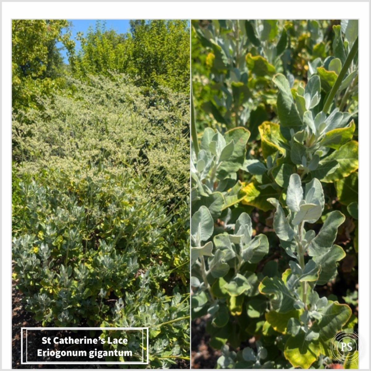 | | Master Gardener Kim Pearson is a longtime native plant gardener. In July Kim's garden features St. Catherine's Lace (Eriogonum giganteum.) The flowers which are just beginning to open, will cover the plant in white flowers for months eventually turning to rust by the end of summer. They make excellent dry flower arrangements. | | |