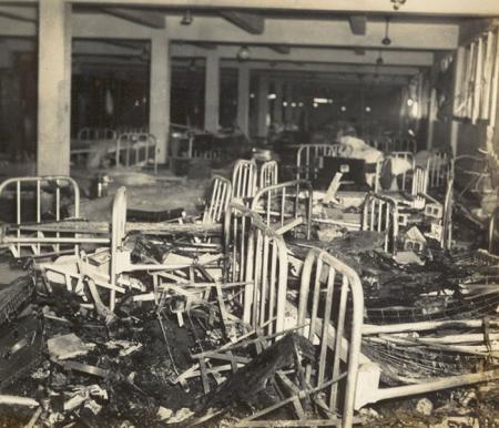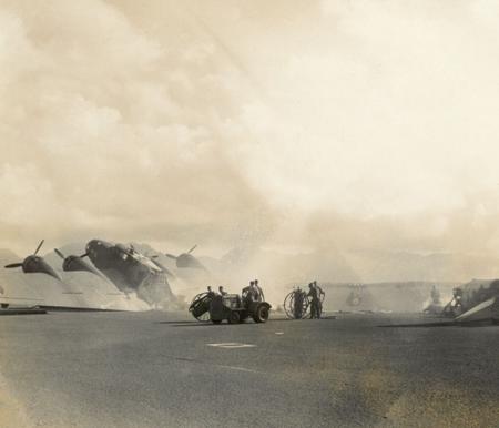 - About 0810 a Japanese plane crashed over the trees near the hospital, passing low (parallel to the Pennsylvania and Downes) with a tail of flame 50 feet long.