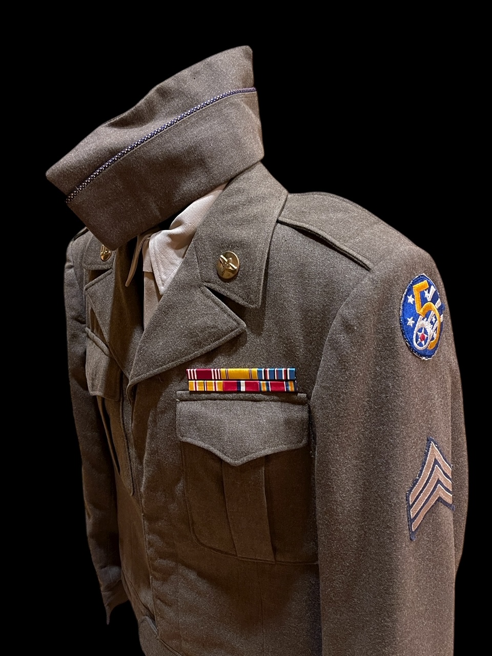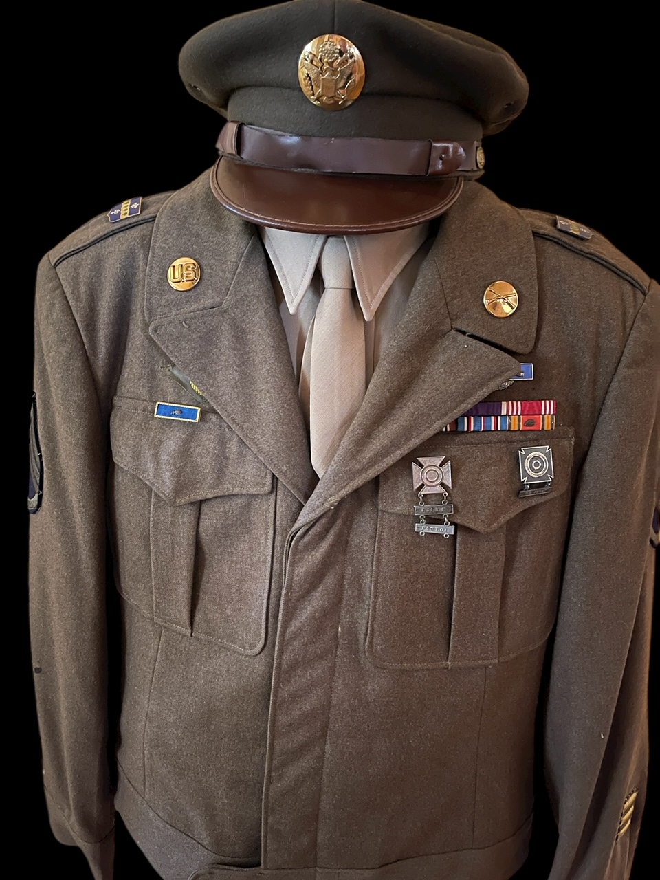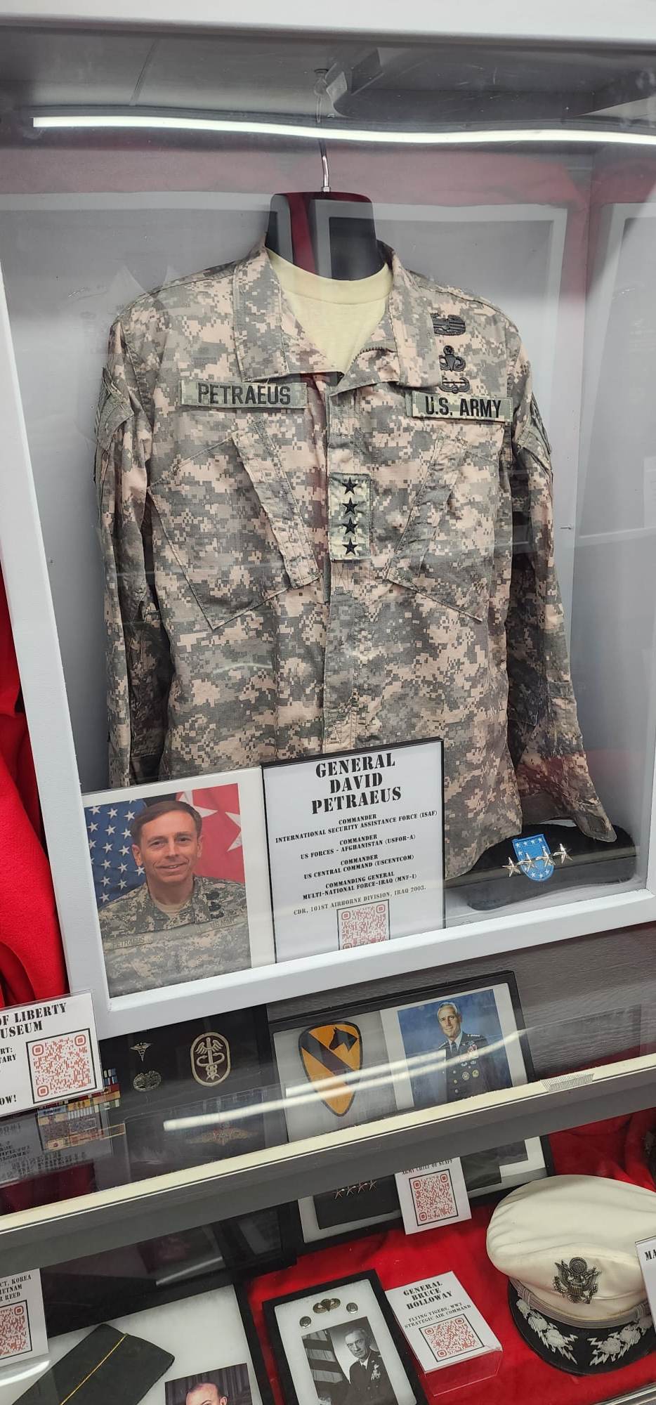 There are over 60 represented in this display. The oldest uniform was from a LT General who as a young Lieutenant fought in the Spanish American War. There is an admiral who had become a Navy Double-Ace in World War II as fighter pilot on both the USS Lexington and USS Enterprise. There is a uniform from one of the commanding generals of the 1st Infantry Division in Vietnam and other commanders during that time. Modern day generals are well represented including the digitals of General David Petraeus, commander of all coalition forces in Iraq/Afghanistan. There are helmets, wings and other artifacts in addition to the uniforms in this snapshot of military leaders of multiple generations.
