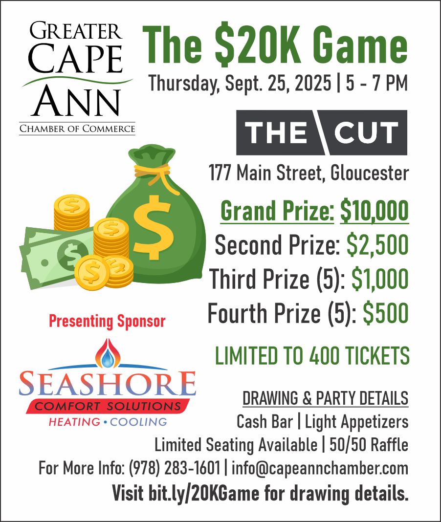 The $20K Game tickets are still available for purchase. Only 400 tickets will be sold, so get your chance to win up to $10,000 today! Reach out to a Chamber Board Member or contact the Chamber directly at 978-283-1601 or at info@capeannchamber.com.