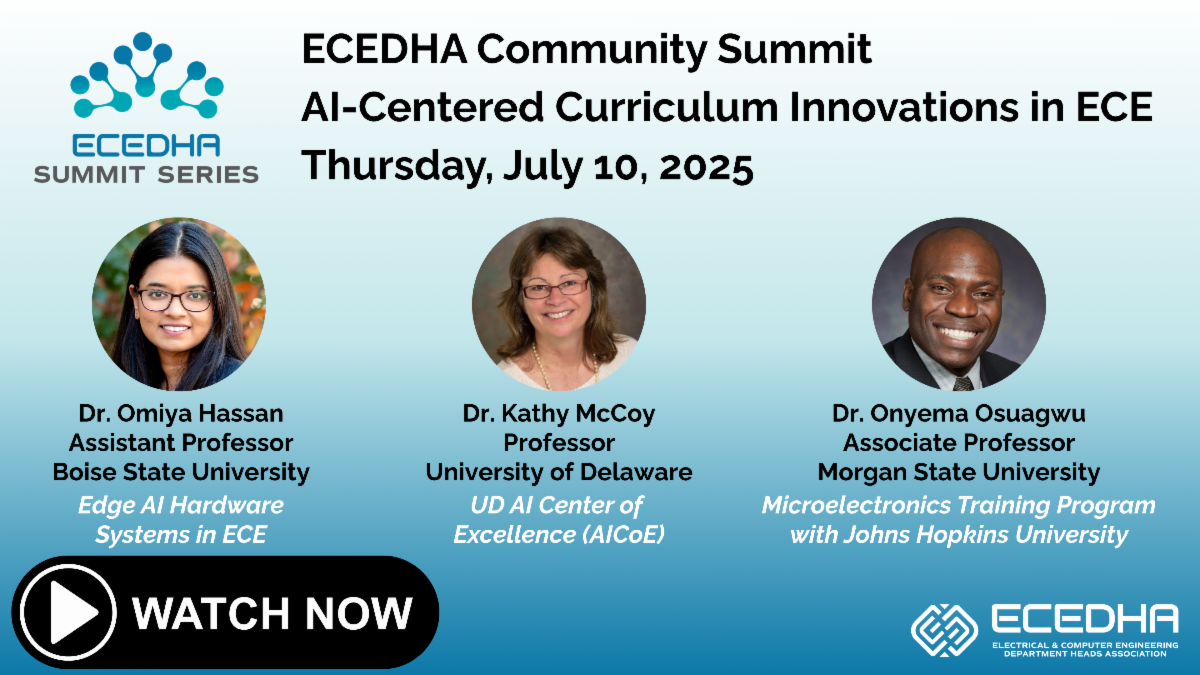 The July 10th ECEDHA Community Summit brought together our members to explore AI-Centered Curriculum Innovation in ECE. The session featured three faculty leaders, each approaching AI integration from different angles and highlighting the shared priorities for preparing the next generation of engineers.