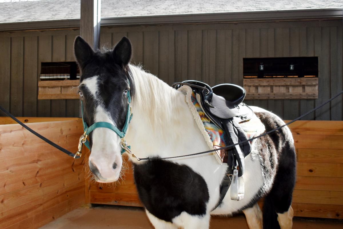 This month we would like to officially introduce Elvis to our wonderful team of therapy horses. Elvis joined the herd in November, and is generously sponsored by our longtime friend, MJ Foletta Fehlhaber. Elvis is undeniably handsome with his baby blue eyes and beautiful black and white coat, and his gentle and kind disposition has earned him quite the fan club at the farm.