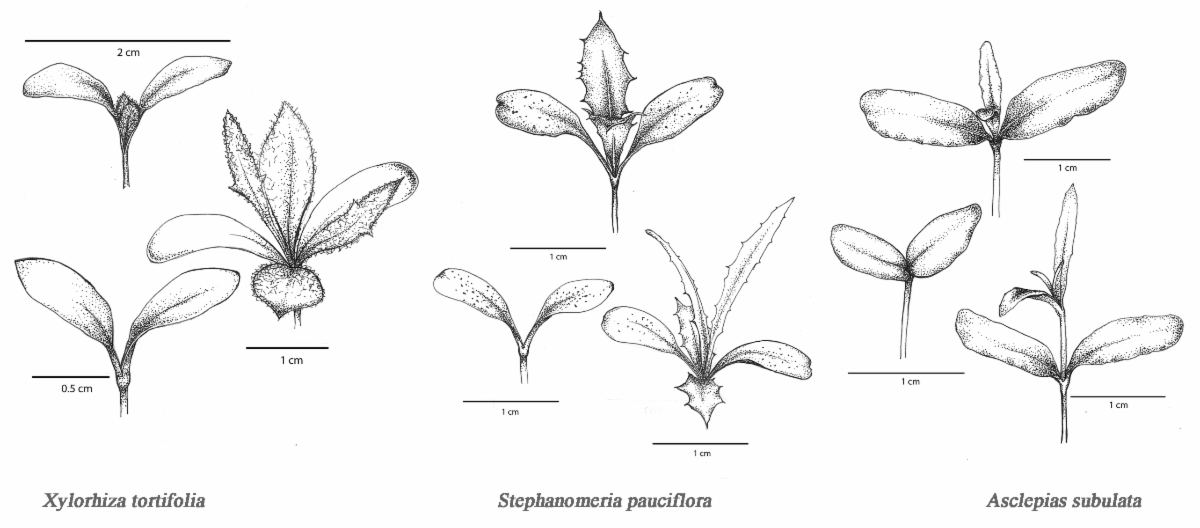 Figure 1: Botanical illustrations of Mojave Desert seedlings by Tiffany Pereira. | Blending science and art, the Desert Research Institute (DRI) Conservation Ecology Lab is creating a guide to identify Mojave Desert native plants at their seed and seedling stages. Supported by the California Bureau of Land Management, this project utilizes traditional botanical illustration (Figure 1) and focus stacking photography (Figure 2) to produce a visually rich, accessible resource. By focusing on young seedlings (cotyledons and first leaves), this guide will support soil seed bank analysis, restoration projects, and identifying natural regeneration in the field. For example, there are private landowners interested in using native plants for landscaping but have trouble locating native plants for sale. Being able to identify naturally occurring native plant seedlings and assist their establishment with abiotic protections would be valuable. Additionally, seed descriptions are often hard to interpret, and images or illustrations are nonexistent for many species. We hope that the artwork of this unique project will not only provide a valuable resource for land managers and fellow researchers but also serve as a tool for public education, reaching a wider audience. | | |