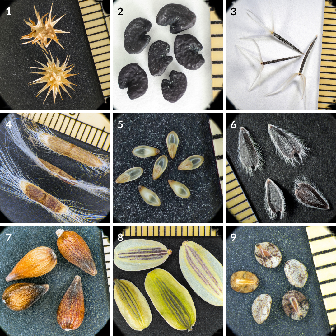Figure 2: Seed photos were composited using Helicon Focus stacking software, combining 6–50 images to achieve full depth-of-focus. 1.) Ambrosia dumosa. 2.) Astragalus geyeri var. triquetrus. 3.) Chaenactis fremontii. 4.) Chilopsis linearis ssp arcuata. 5.) Dasyochloa pulchella. 6.) Encelia farinosa. 7.) Ephedra nevadensis. 8.) Lomatium parryi. 9.) Salvia columbariae.