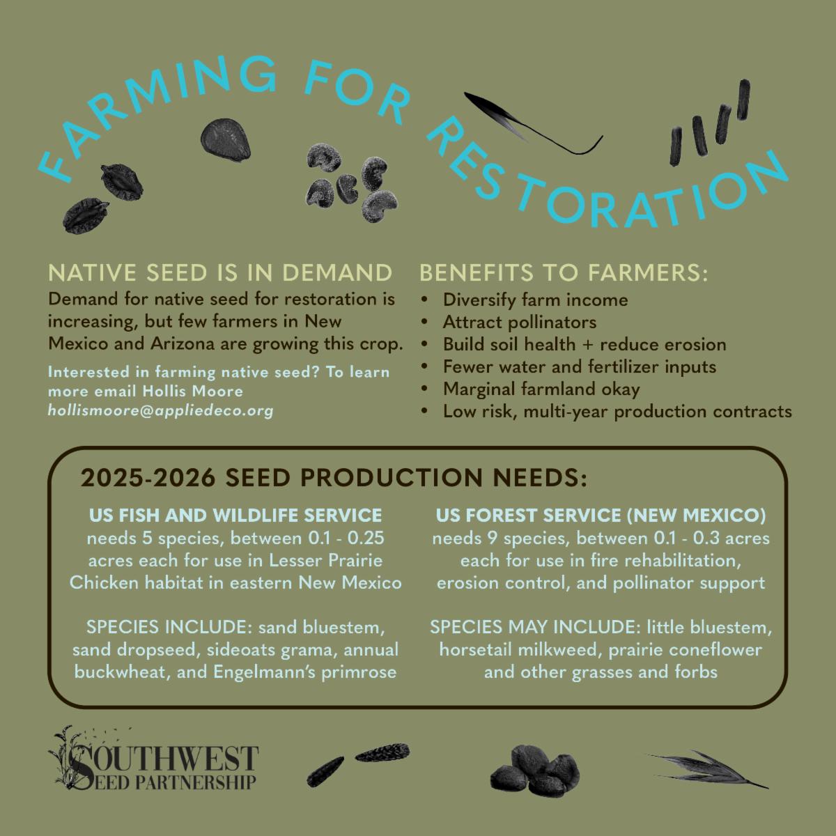 The Southwest Seed Partnership works with farmers to grow diverse locally collected wild seeds for restoration. We support farmers by acting as a bridge between buyers and growers of native needs, providing starting seed or nursery plugs, establishing low-risk, multi-year production contracts, assisting farmers with grant writing to expand capacity, and working to ensure high-quality seed through coordination with New Mexico and Arizona seed certification. | | |
