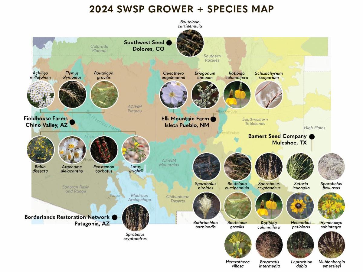 Diverse nurseries and farmers in strategic locations across the Southwest play a foundational role in our ability to grow plants for our partners. In 2024, existing contracts were renewed and expanded with Fieldhouse Farms (Chino Valley, AZ), Elk Mountain Farm (Isleta Pueblo, NM), Borderlands Restoration Network (Patagonia, AZ), Southwest Seed (Dolores, CO), and Bamert Seed Company (Muleshoe, TX). The Pueblo of Santa Ana Native Plant Nursery (Bernalillo, NM) continues to be an instrumental collaborator for the SWSP, as they expertly and thoughtfully grow thousands of restoration and production plugs for our projects in their greenhouses. The opportunity to work with two new nurseries, Backyard Farms (Las Cruces, NM) and Conley’s Nursery (Ruidoso, NM) expanded our plant materials network into Southern New Mexico.
