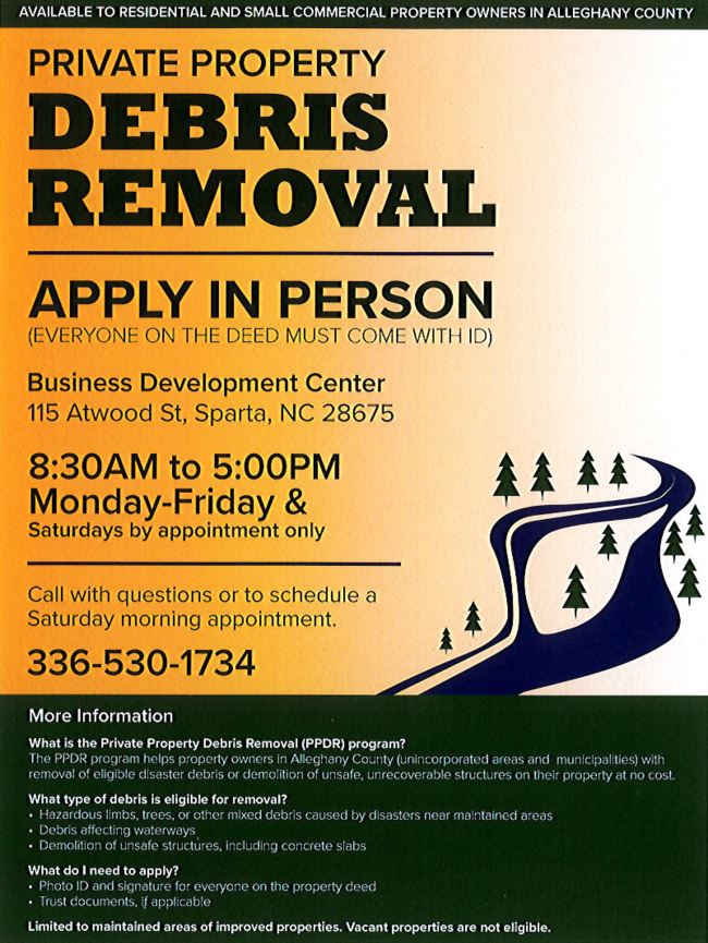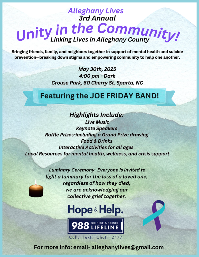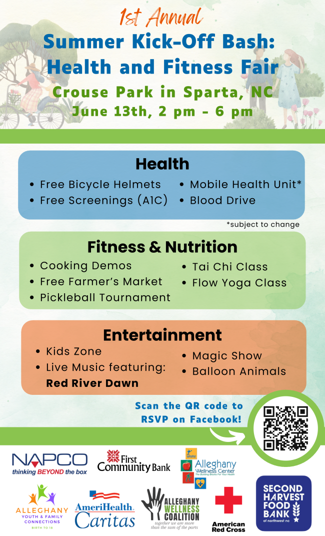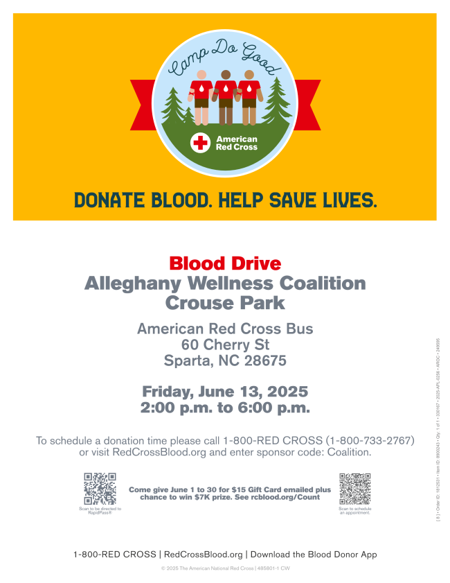 Piney Creek Non-food Pantry: Mount Zion UMC of Piney Creek hosts this event the 2nd Tuesday of each month, 10a - 2p, and the 4th Tuesday, 4p - 6p. Call Alleghany in Motion at 336.372.8747 if you need a ride.