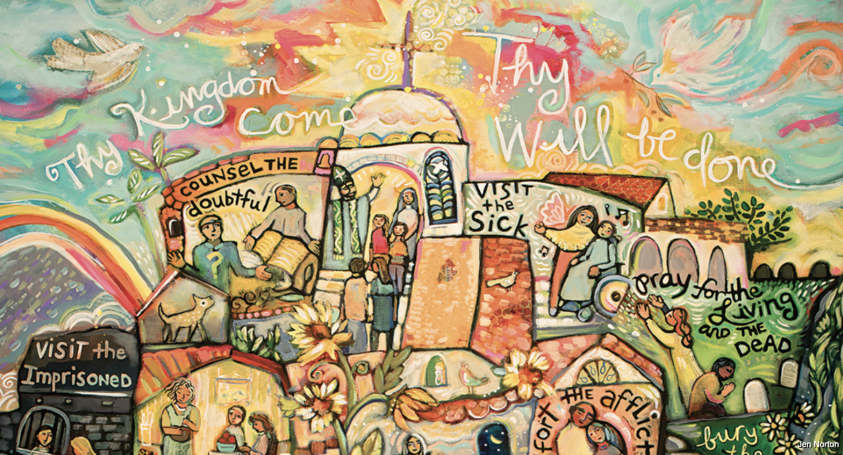 | | | Acrylic on canvas artwork by Jen Norton illustrating the corporal and spiritual works of mercy leading up to the kingdom of heaven. | |