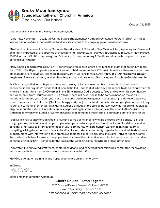 SNAP recipients across the Rocky Mountain Synod states of Colorado, New Mexico, Utah, Wyoming and Texas will be directly impacted by the absence of these benefits. They include: