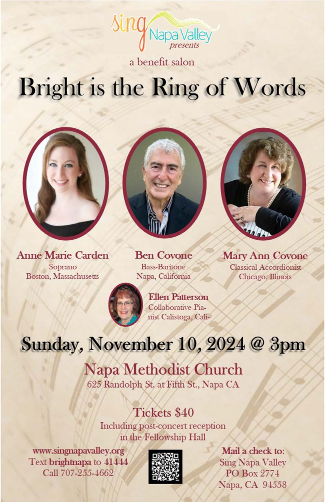 BRIGHT IS THE RING OF WORDS (AND MUSIC TOO): A SALON BENEFIT FOR SING NAPA VALLEY