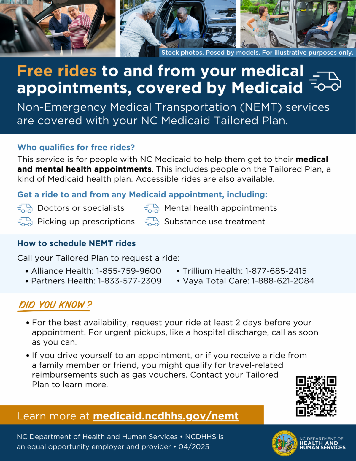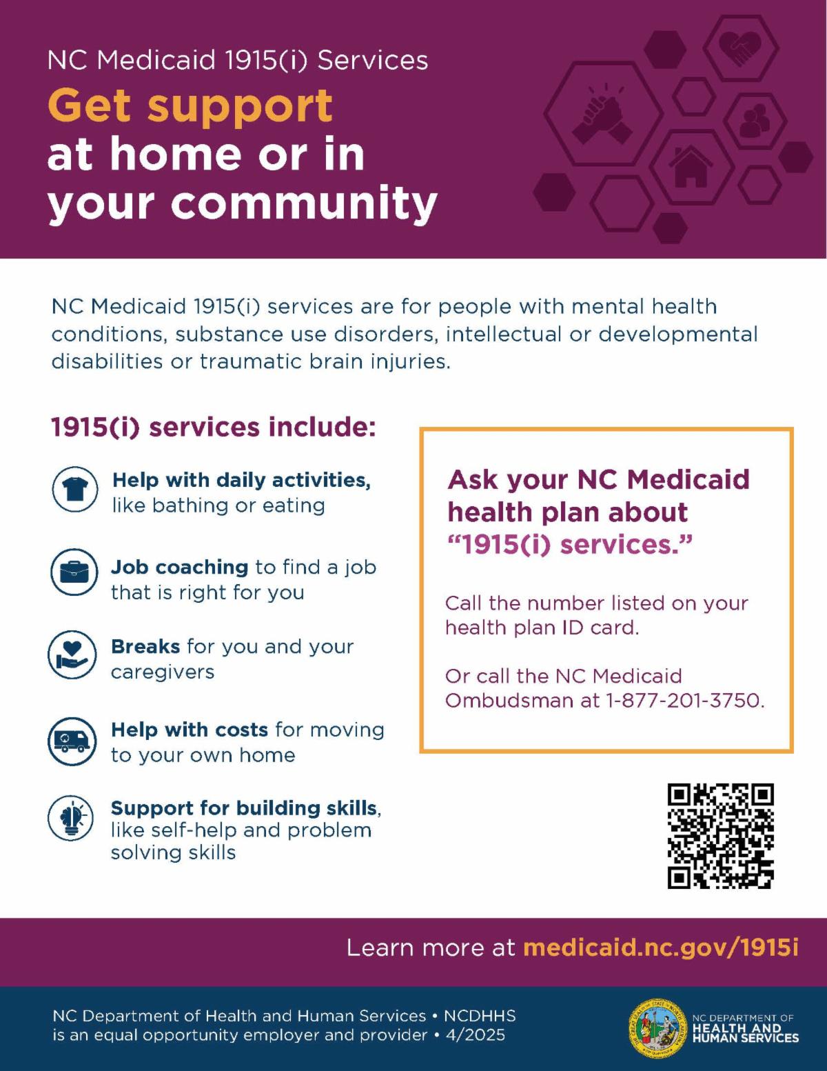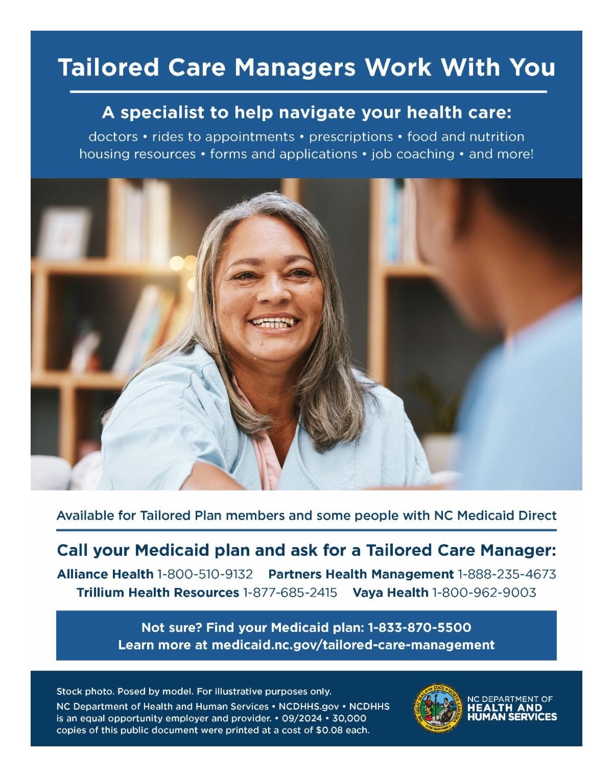 Order free, printed copies of informational fliers and brochures about Tailored Plans, Tailored Care Management, 1915(i) services, and the NC Innovations Waiver. Resources are available in English and Spanish. Each order will include 100 free, printed copies of the resources of your choice. Items will be shipped directly to your organization. Shipping is also free! To receive your materials, just fill out an order form by May 16, 2025. Orders will begin shipping mid-May. |