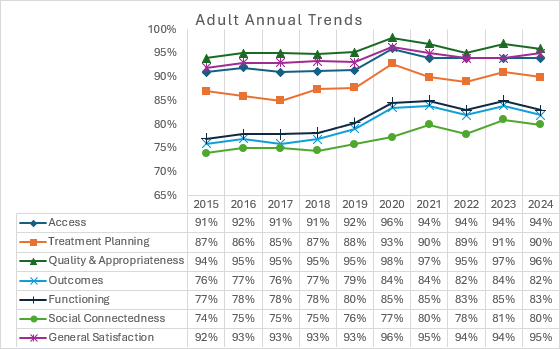 The 2024 report includes responses from 5,698 individuals who received services. In this survey, respondents report positive perceptions across each of the following categories: